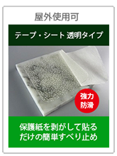 透明タイプの滑り止めテープです。貼るだけなので誰でも簡単に施工可能です。屋外で使用しても剥がれにくいのが特徴です。 剥がす時もノリが残ることがないので、貼り替えも簡単です。透明度が高く、膜厚も薄いのでほとんど目立ちません。