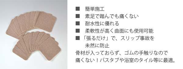 8cm×8cmのゴム状の滑り止めテープです。バスルームなどの水回りに最適です。骨材は配合されていないので、素足でも違和感がありません。 素材との密着強度も高く、剥がれにくいのが特徴です。
